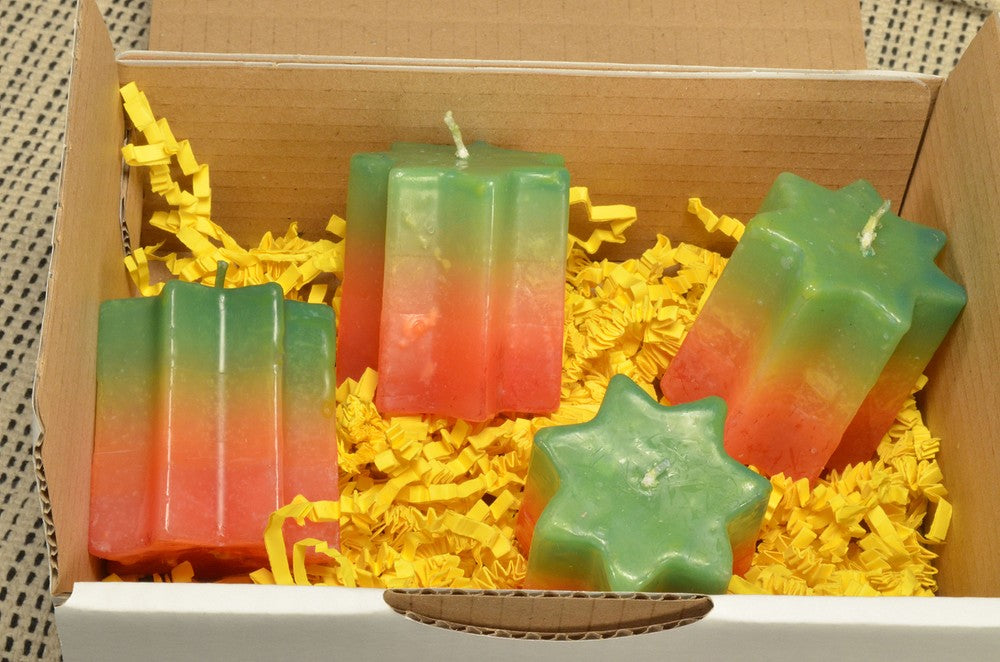 Geschenkbox mit 4 schönen Sternkerzen. Diese Kerzen sind jeweils in 3 Farben erhältlich: Grün, Gelb und Zartrot - SCHAUEN SIE SICH DAS VIDEO AN