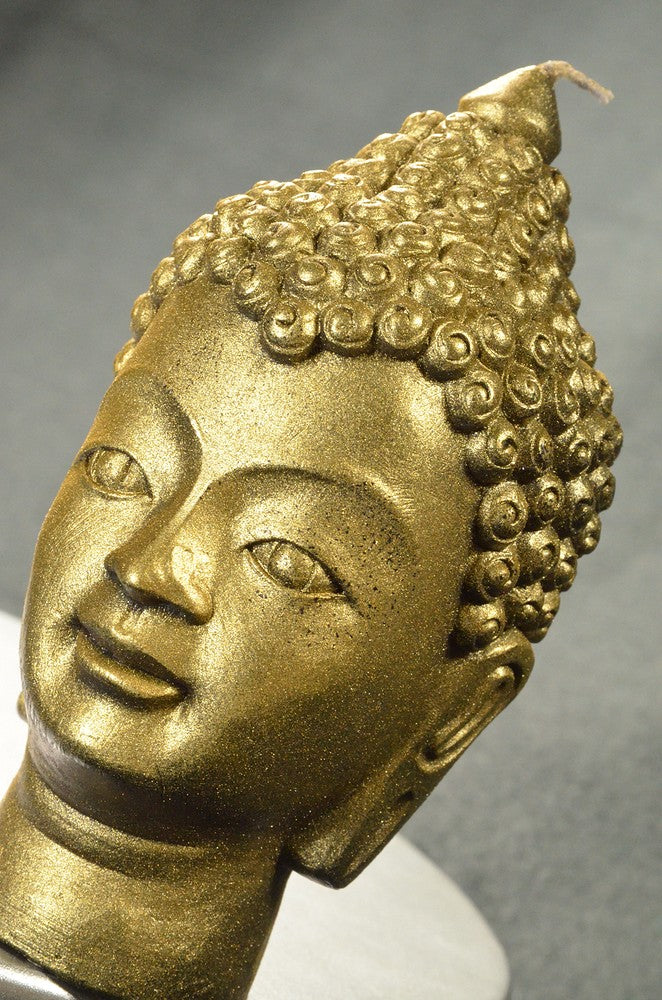 Buddha-Kopfkerze, handgegossen in GOLD-Metallic. Eine schöne Kerze für den Liebhaber und es ist natürlich nicht zwingend erforderlich, sie anzuzünden. Komplett handgefertigt und wunderschön verarbeitet.