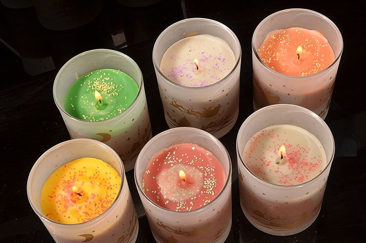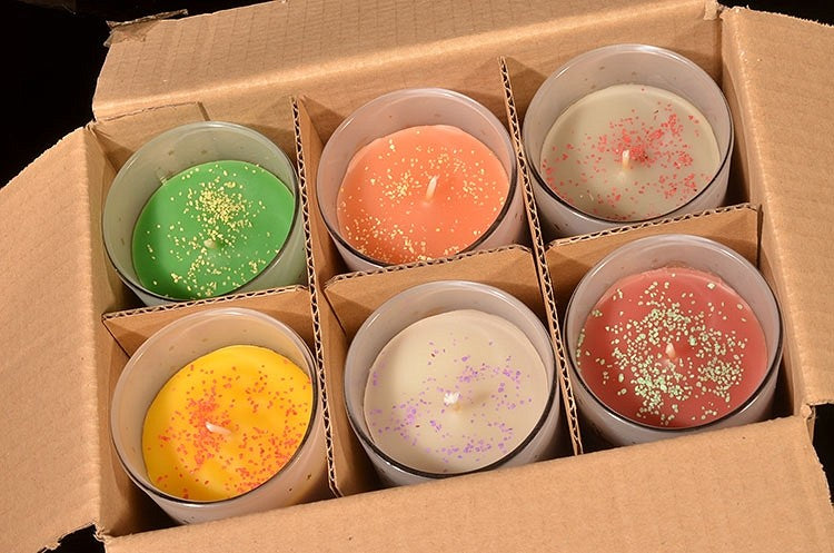 Set mit 6 verschiedenen Weihnachtskerzen in einem schönen, mattierten Glas.