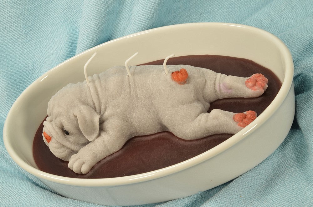 Ein wunderschöner, liegender Hund in einer Schokoladenpuddingkerze.