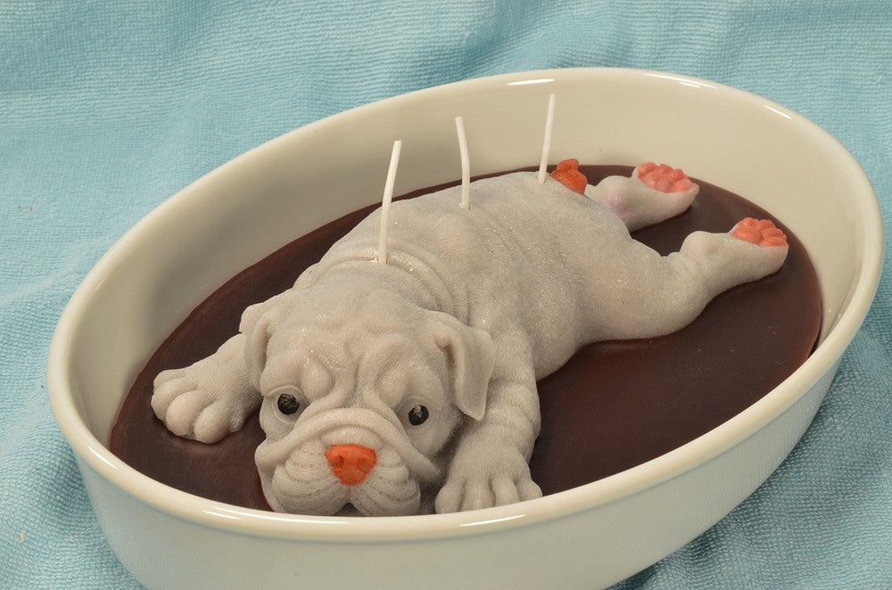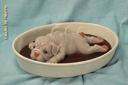 ===================================== Ein wunderschöner, liegender Hund in einer Schokoladenpuddingkerze. Du hättest kein schöneres Geschenk mitbringen können! Eine dreidochtige Kerze in einer Keramikschale.