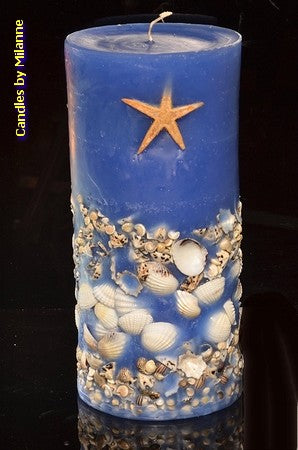 ===================================== Supergroße Meereskerze in wunderschönem Blau. Diese Kerze ist 26 cm hoch und besteht aus echten Muscheln.
