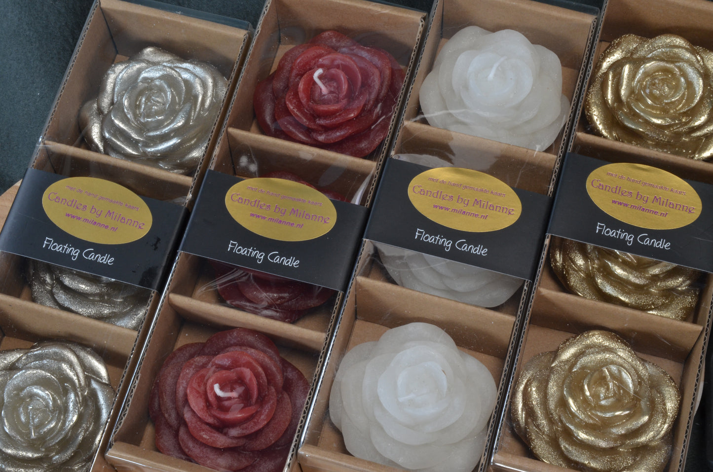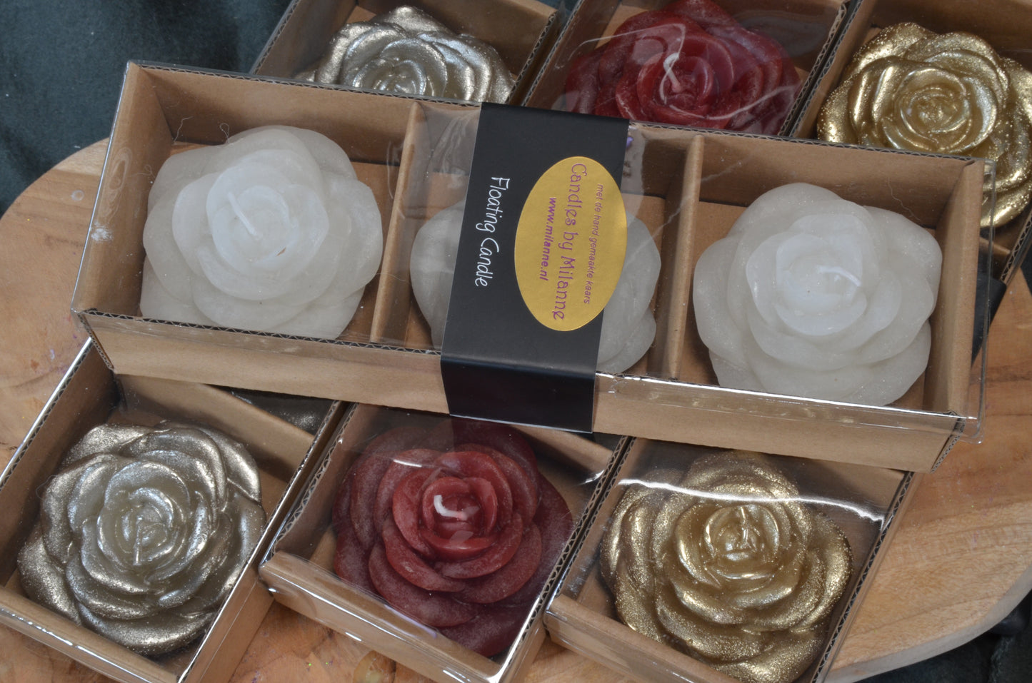 ============================== Nieuw voor 2025: Geschenkdoos met 3 supergrote DRIJFKAARSEN in de vorm van een Bloem. Deze kaarsen-set is ook beschikbaar in Zilver, Goud en Wit. Iedere kaars heeft een brandtijd van 5 uren. BEKIJK DE VIDEO
