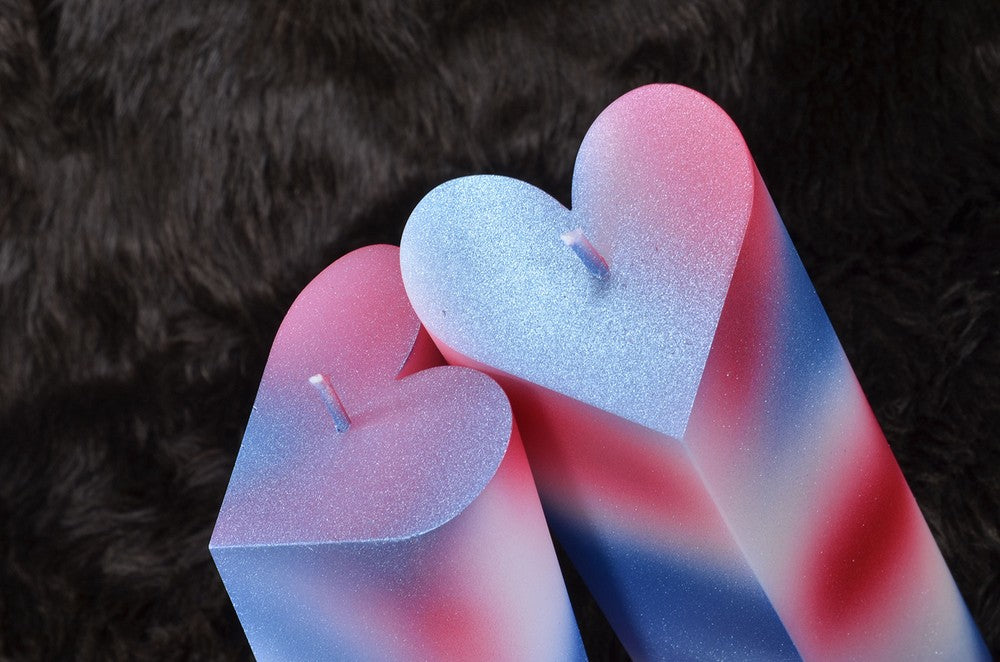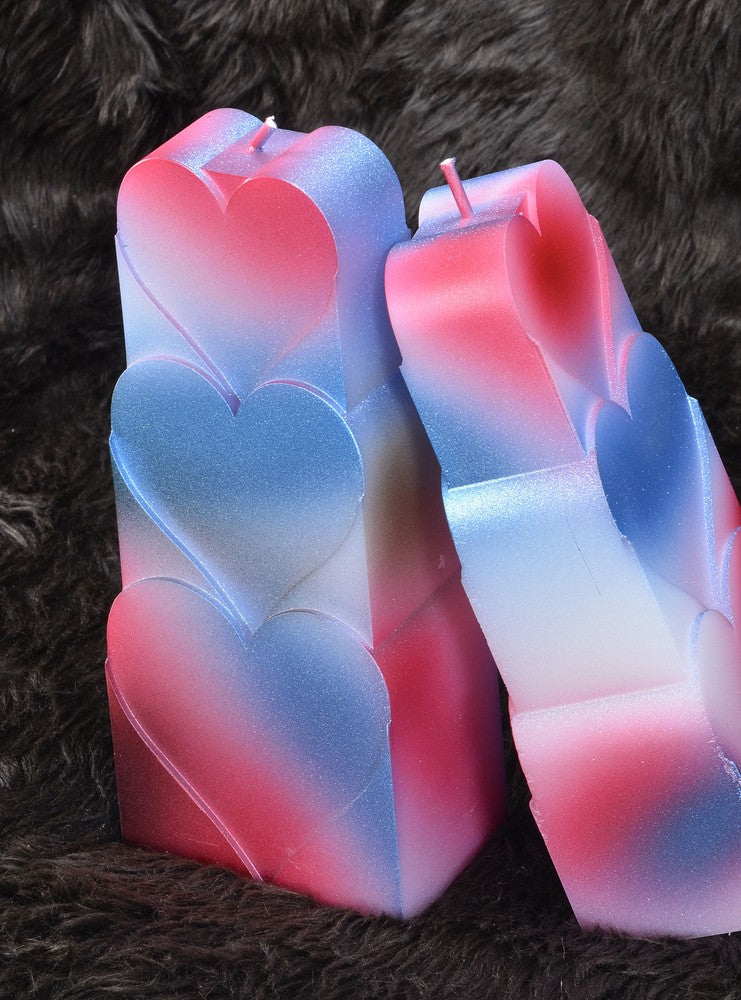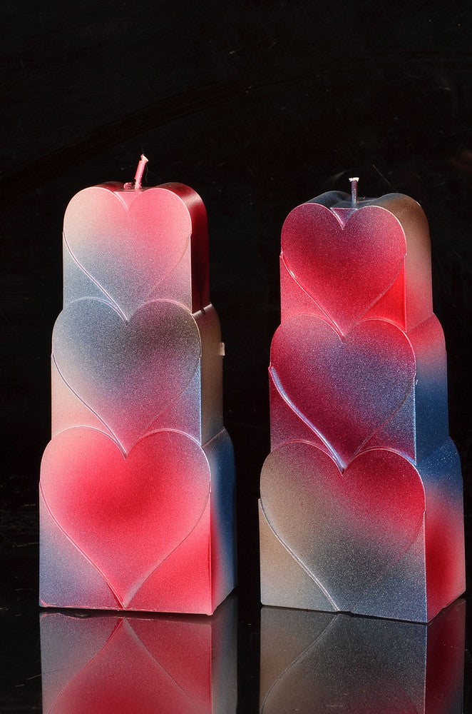 Super romantische gestapelde hartenkaars.. Hij is opgebouwd uit drie harten en daarna met de hand afgewerkt.