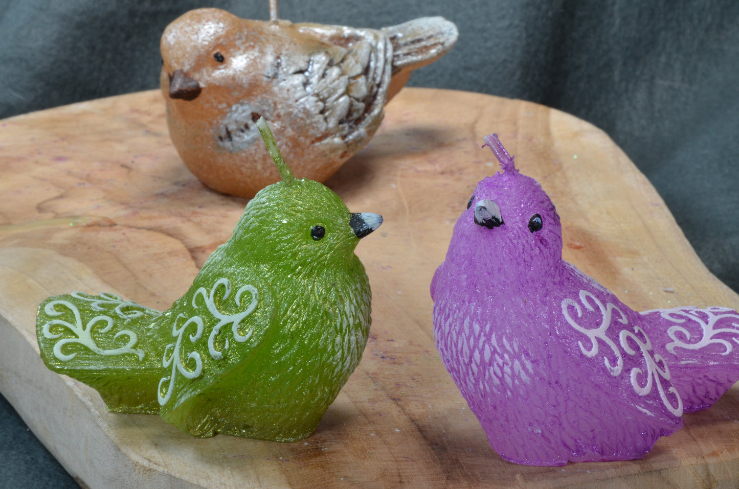Set van 5 verschillende Vofgeltjes Kaarsen. Allemaal zijn ze met de hand gemaakt.